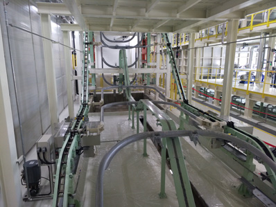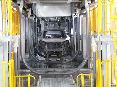 2、 浸槽垂直爬坡角度大(45°),入槽速度快,排氣好。縮短了前處理和電泳設備的長度。降低了前處理設備成本。